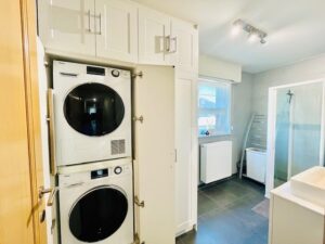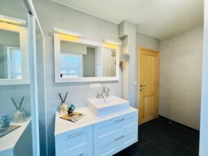De badkamer is uitgerust met een douche, een lavabo met Engelse kranen en handige maatkasten met ruimte voor je was- en droogautomaat.